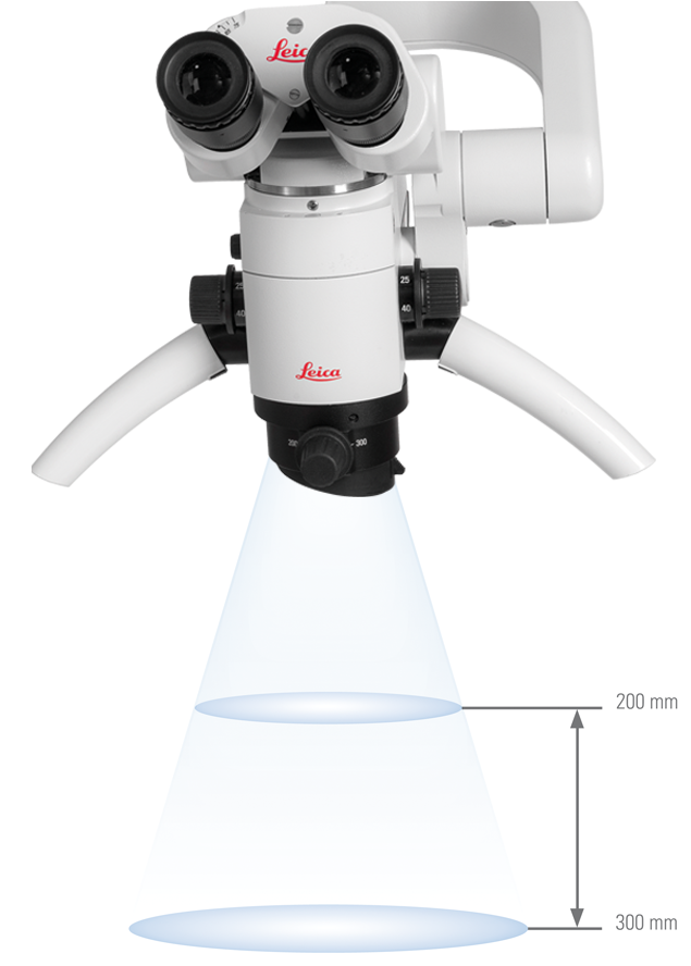 Przesuw ramienia w zakresie góra – dół odbywa się na dystansie 800 mm. Wszystkie przeguby dla wszystkich osi obrotu są regulowane hamulcami mechanicznymi, śruby hamulców są idealnie wpasowane w obudowę, nie wystają poza nią. Do regulacji hamulców jest dołączona gałka. Przewody zasilania i światłowód schowany jest wewnątrz obudowy mikroskopu. Mikroskopy Leica są bardzo higieniczne i łatwe do utrzymania w czystości i aseptyki: metalowe obudowy, gładkie powierzchnie pokryte powłoką z nano – srebra. Konstrukcja jest minimalistyczna i bardzo stabilna.