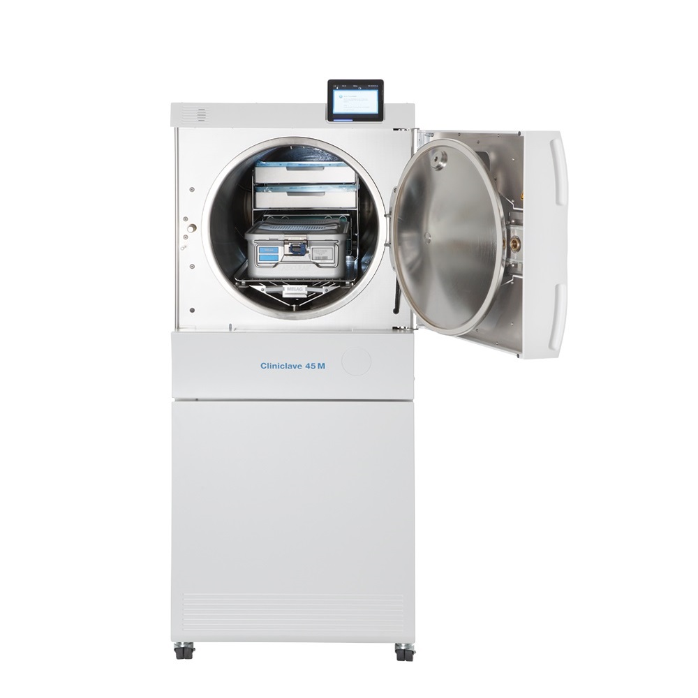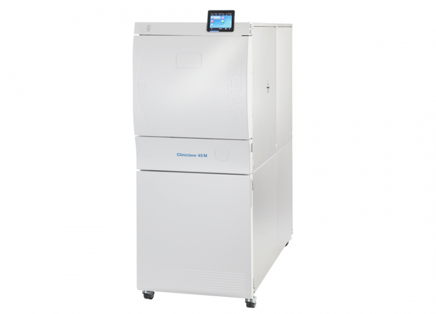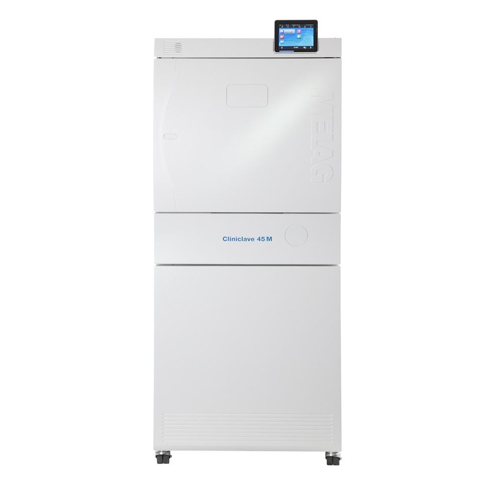 Niskie zużycie wody i energii, a jednocześnie możliwość sterylizacji dużych wsadów w krótkim czasie zostało osiągnięte dzięki doświadczeniu producenta i zastosowaniu najnowocześniejszych rozwiązań. Komora o średnicy 44 cm i długości 134 cm mieści dwie jednostki sterylizacyjne. Specjalny system uchwytów pozwala na używanie koszy, pojemników i kontenerów różnych producentów w praktycznie wszystkich obszarach zastosowania. Wydajna pompa próżniowa i technologia podwójnych płaszczy zapewnia niedoścignione parametry pracy. Autoklaw oferuje 5 programów (klasa B i S) oraz programy testowe. Cliniclave 45M w programie uniwersalnym B przy pełnym załadunku 70 kg osiąga czas sterylizacji 78 minut wraz z suszeniem co jest doskonałym wynikiem. Obsługa autoklawu jest bardzo prosta i intuicyjna. Duży, dotykowy, kolorowy wyświetlacz XXL prowadzi użytkownika po menu zapobiegając ewentualnym błędom obsługi. Zintegrowane oprogramowanie dokumentuje i weryfikuje pracę, zapewnia powtarzalność i bezpieczeństwo każdego cyklu. Rejestracji danych można dokonać poprzez łącze Ethernet, zintegrowaną kartę CF, opcjonalnie wydruk etykiet z kodami kreskowymi na drukarce MELAprint 60 lub pełna dokumentacja procesu pracy za pomocą oprogramowania MELAtrace.