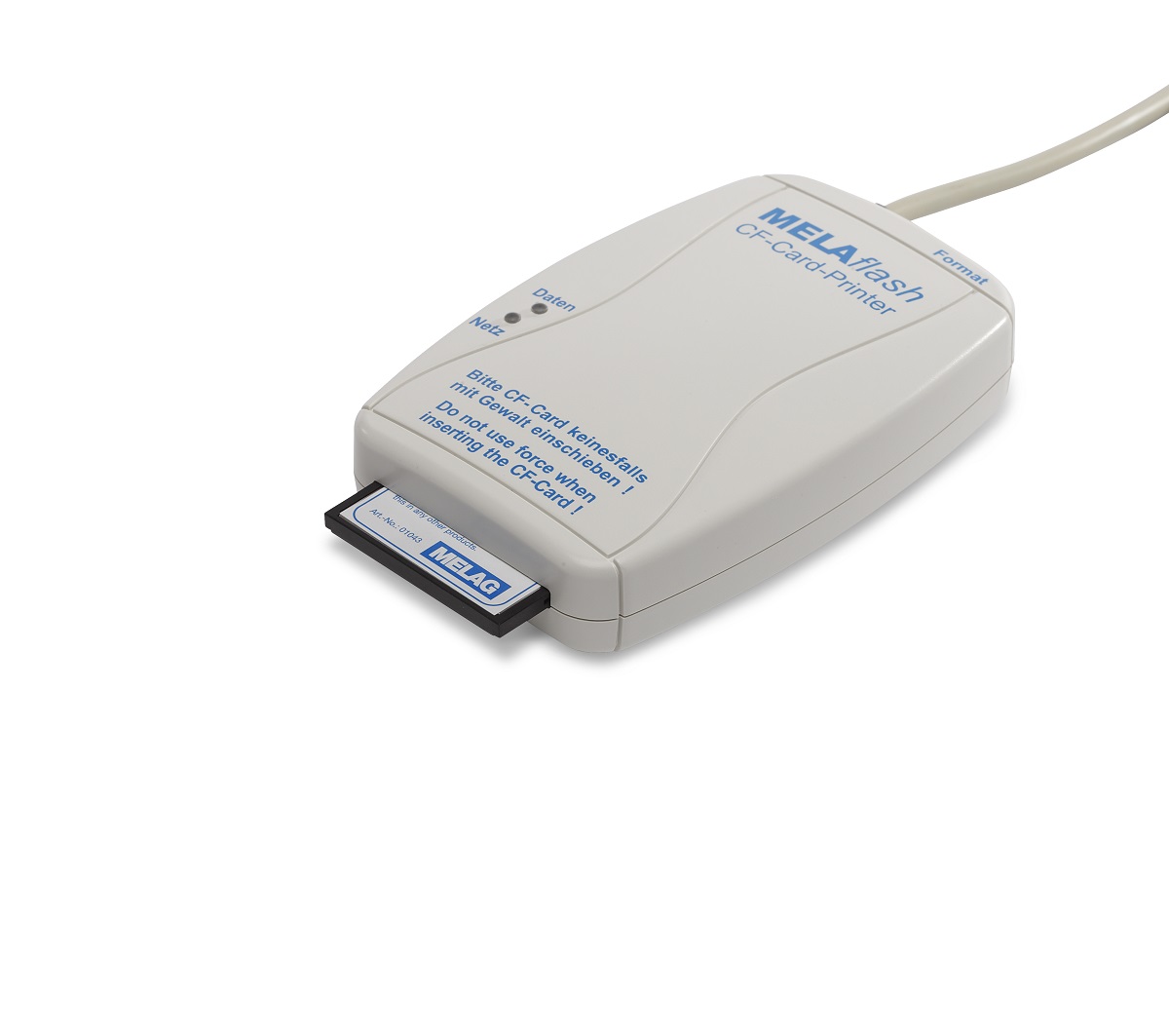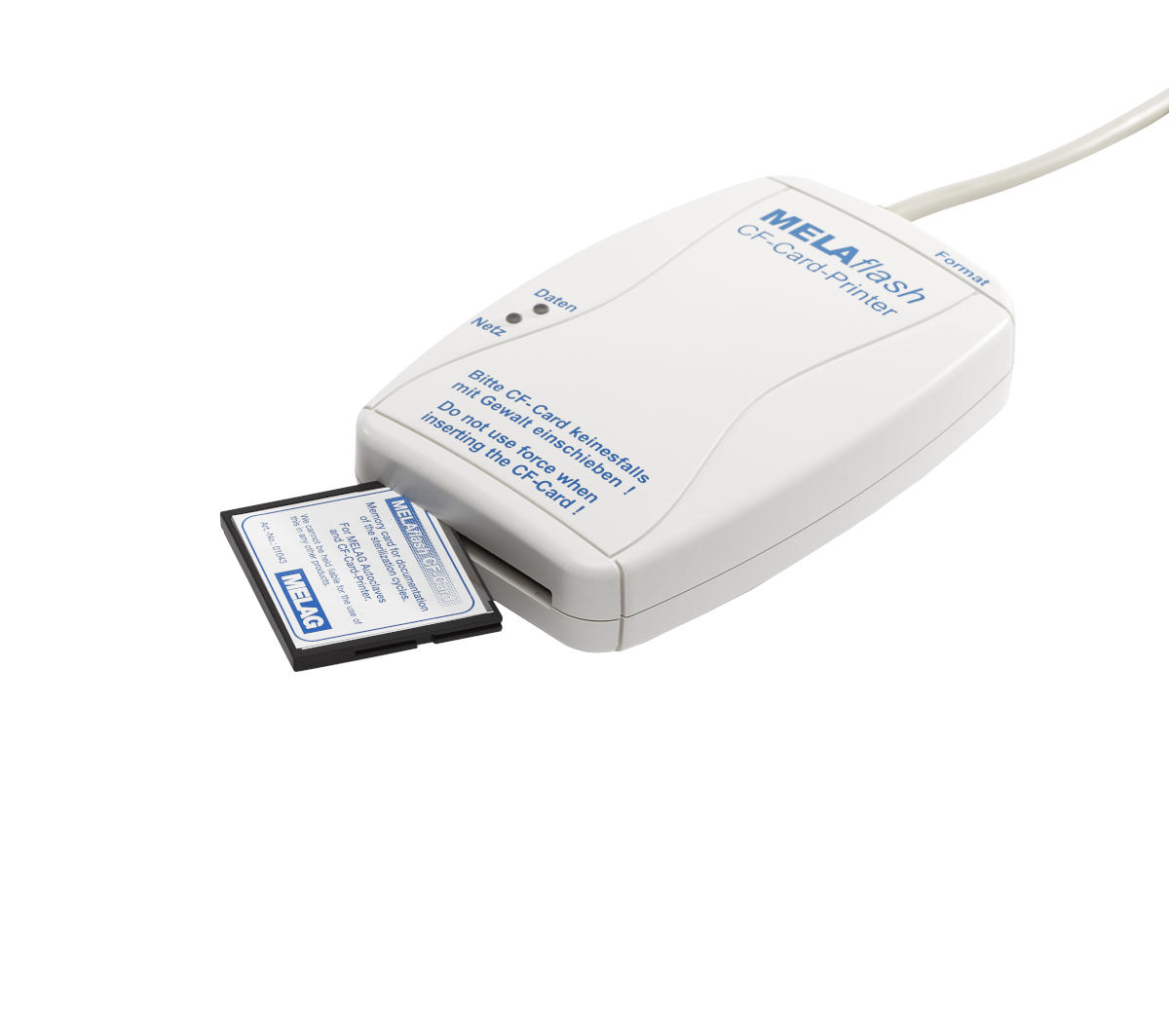 MELAflash rejestrator korzysta z gniazda szeregowego, które jest standardowym wyposażeniem autoklawów i zgrzewarki MELAseal Pro. Jest to urządzenie zewnętrzne bardzo małych rozmiarów. Kartę CF odczytuje się w komputerze i tam gromadzi się i archiwizuje dane. Zapis dokonuje się w pliku tekstowym dostępnym w każdym komputerze. Zakres dostawy obejmuje rejestrator z przewodem, kartę CF oraz czytnik kart.