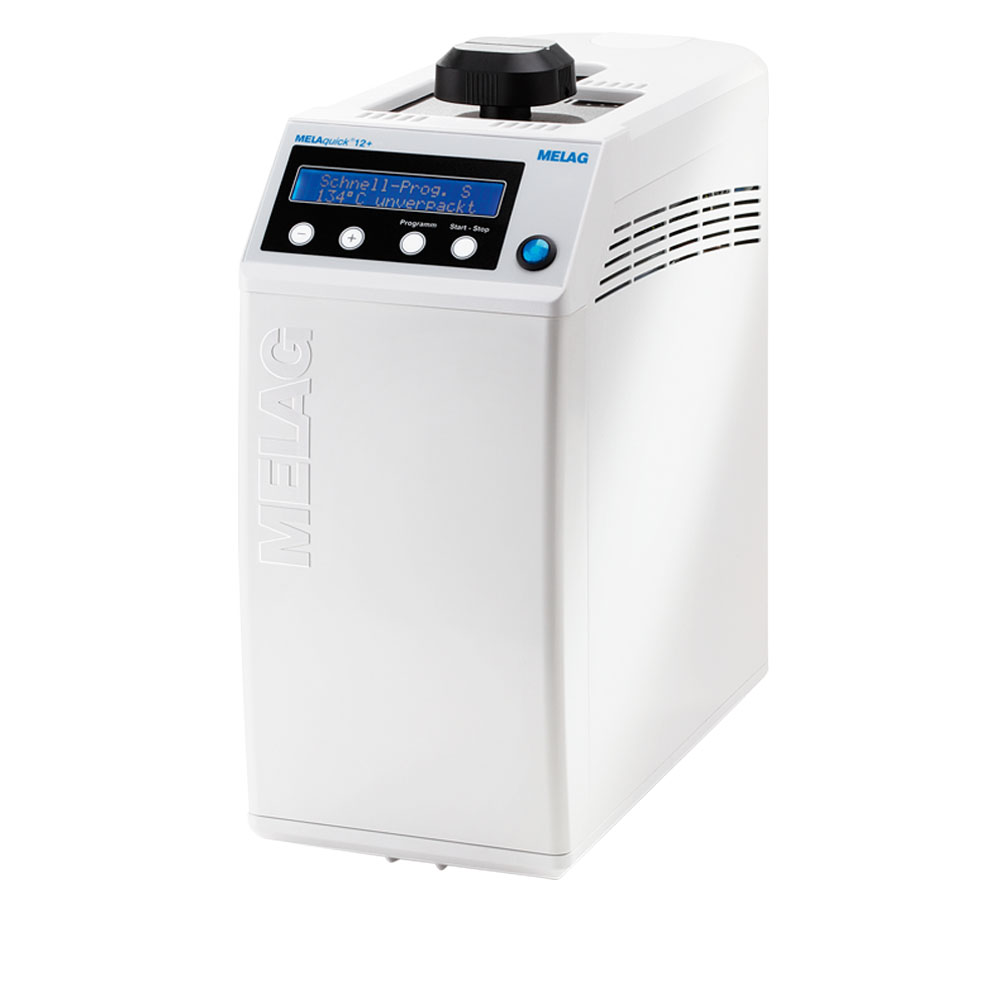 MELAquick 12+p jest alternatywą do standardowych autoklawów stosowanych w gabinetach stomatologicznych. Model 12+p jest wyposażony w zintegrowaną sprężarkę powietrza, dzięki czemu jest niezależny i może być postawiony w dowolnym miejscu niezależnie od instalacji sprężonego powietrza. Szybkie cykle w klasie S pozwalają na sterylizację 12 sztuk narzędzi lub 6 instrumentów w zaledwie 7 minut. Skuteczna sterylizacja i suszenie w tak krótkim czasie ogranicza zakup dodatkowych instrumentów. Kompaktowe gabaryty autoklawu pozwalają na usytuowanie go w każdym gabinecie stomatologicznym. Obsługa jest szybka i prosta dzięki tylko 4 przyciskom i krótkim komunikatom na wyświetlaczu. Rejestracja procesu sterylizacji może być zrealizowana za pomocą opcjonalnego rejestratora MELAflash z kartą pamięci CF.