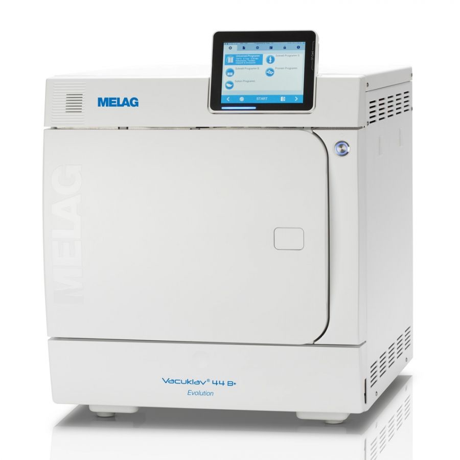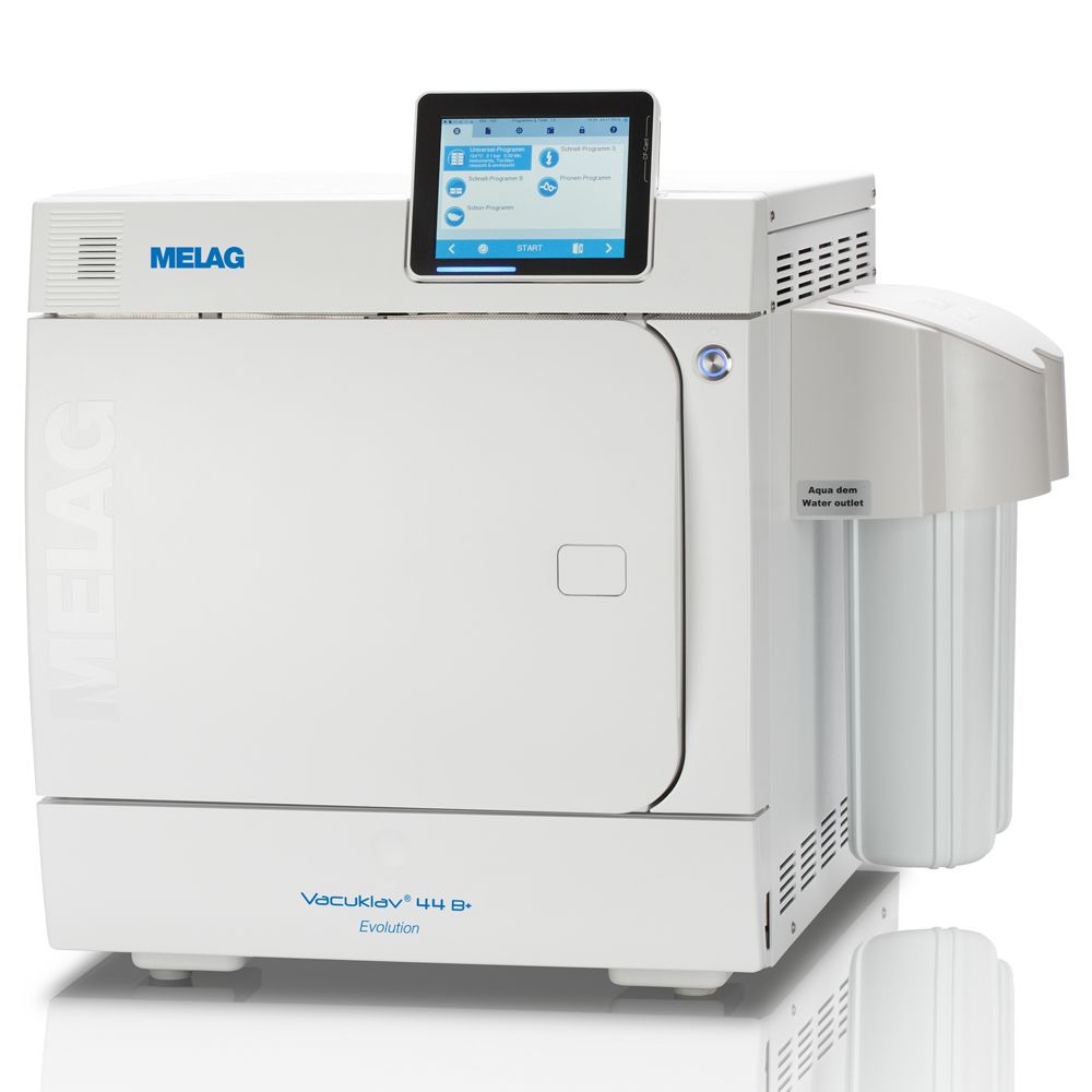 MELAG Vacuklav 44B+ wymaga stałego podłączenia wody. Jest bardzo wydajnym i szybkim autoklawem. Oferuje 5 programów do sterylizacji (B i S) i 2 programy testowe (Vacuum oraz Bowie&Dick). Standardowy załadunek to 7 kg lub 9 kg przy włączeniu funkcji dodatkowego suszenia i zastosowaniu stelaża na 8 tac. Program szybki B dla instrumentów opakowanych trwa zaledwie 20 minut.